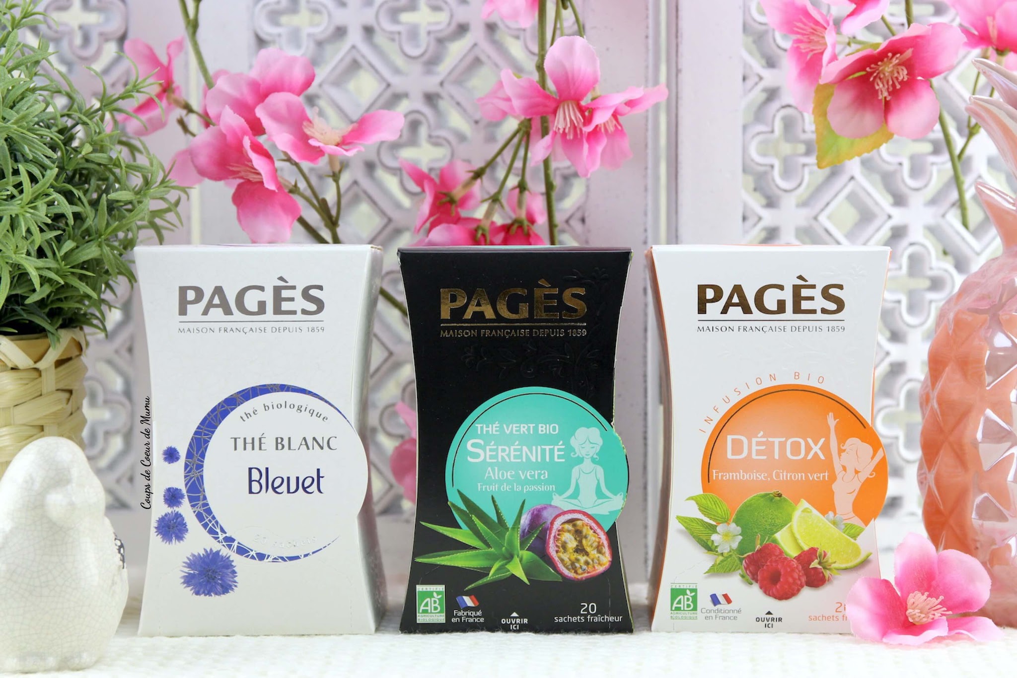 Ma sélection du jour se compose du Thé Blanc au Bleuet, du Thé Vert Sérénité à l’Aloe Vera et au Fruit de la Passion et de l’Infusion Détox à la Framboise et au Citron Vert que vous pouvez retrouver sur le site internet Pagès ou en grandes surfaces.